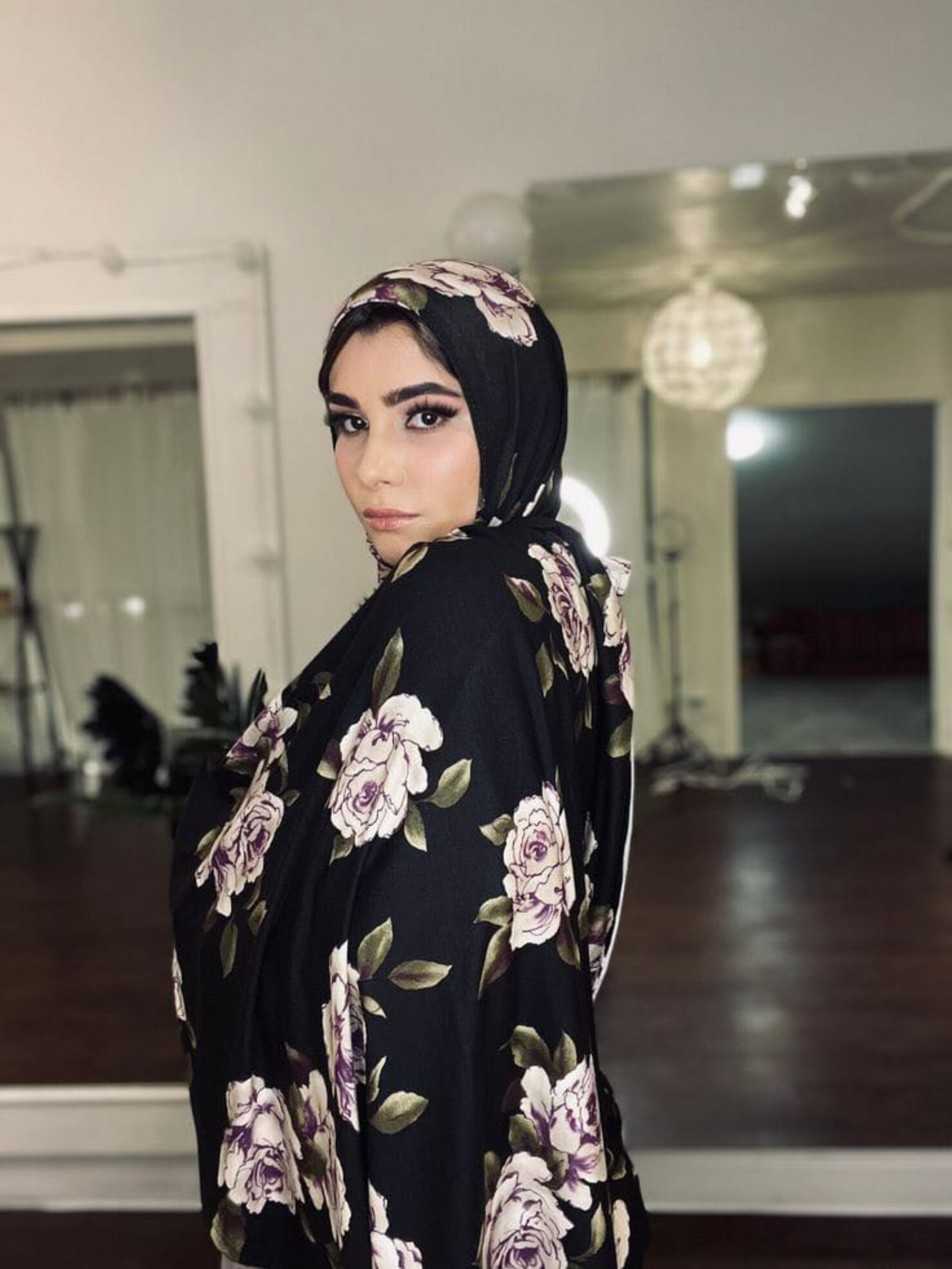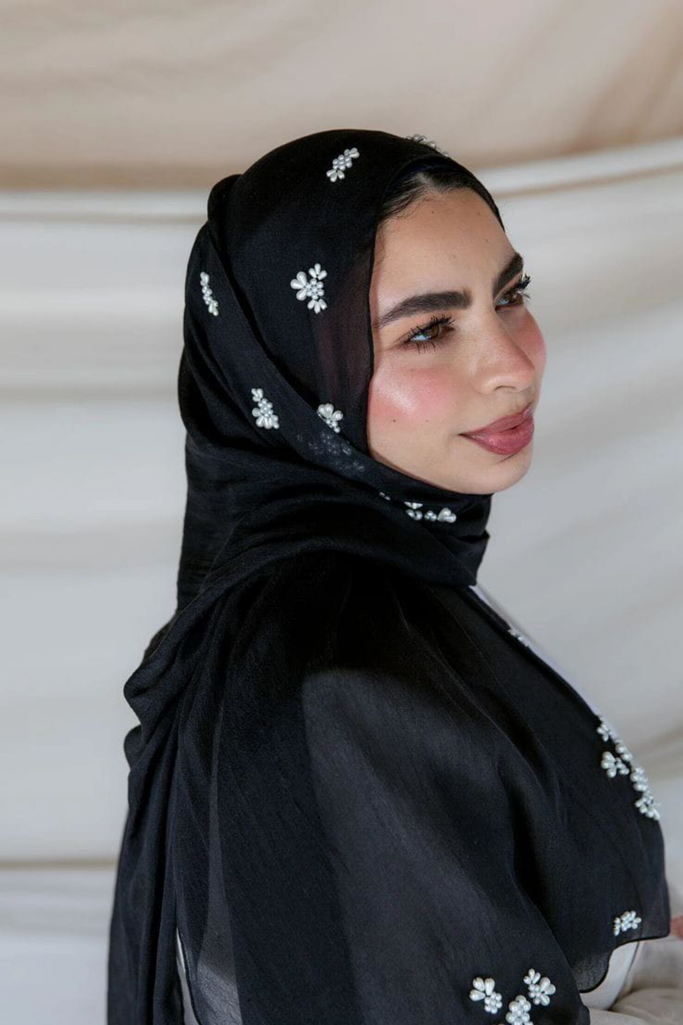 Black Chiffon Hijab with Pearl Embroidered Flowers